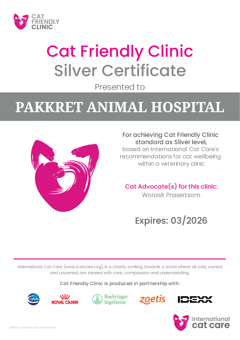 โรงพยาบาลสัตว์ปากเกร็ด ได้รับการรับรองให้เป็น คลินิกที่เป็นมิตรต่อแมว (Cat Friendly Clinic) จาก International Society of Feline Medicine (isfm) ซึ่งเป็นมาตรฐานสากล